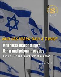 Third, the restoration of the Nation of Israel to true faith in the God of Abraham, Isaac, and Jacob will occur suddenly in one day after the seven-year Tribulation Week, when Messiah Jesus returns “Shall the Earth be made to bring forth in one day? or shall a nation be born at once? for as soon as Zion travailed, she brought forth her children” (Isaiah 66:8).  Israel was born in one day on May 14, 1948.
